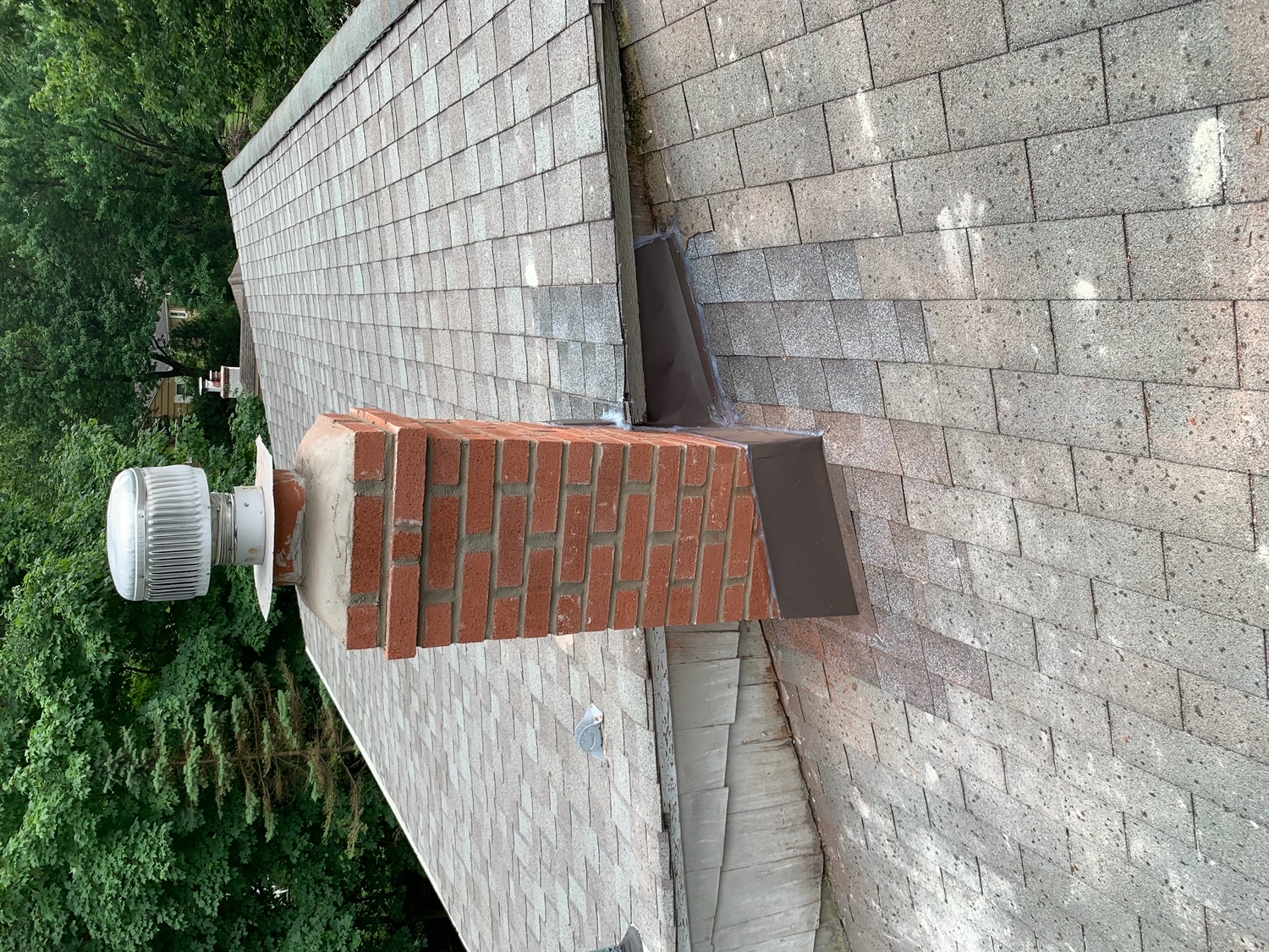 The chimney had not been maintained in over 20 years. Freeze-thaw cycles had expanded cracked mortar joints, allowing water infiltration that was staining interior walls. The top two courses of brick were unstable and needed full reconstruction. The existing counter flashing had corroded away, and the step flashing was improperly installed by a previous contractor — the primary source of a recurring roof leak.