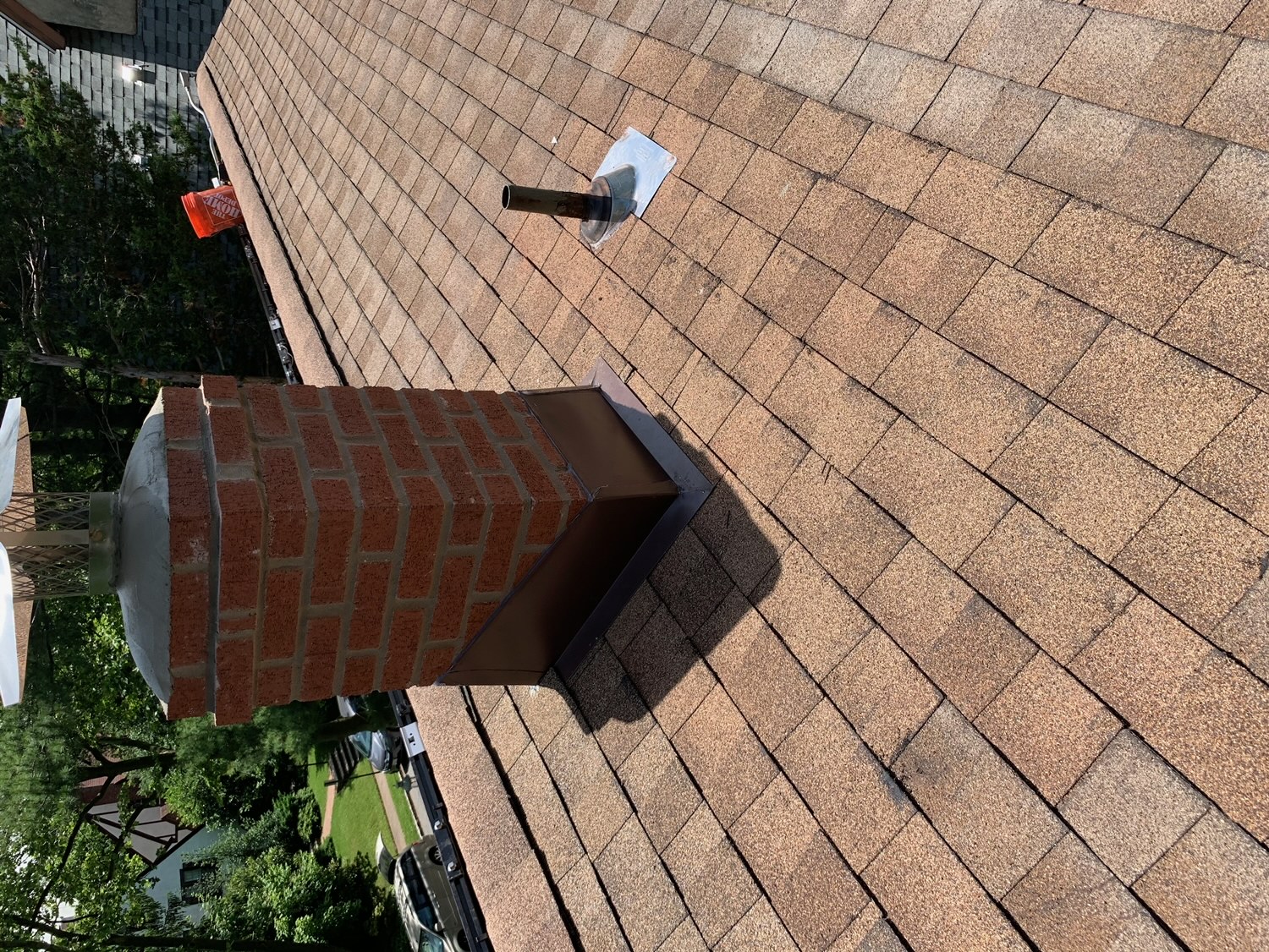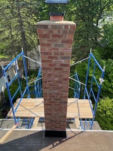 Scaffolding erected for safe working platform. Top two unstable brick courses carefully demolished and rebuilt with matching brick and Type S mortar. All remaining mortar joints ground out 3/4" deep and repointed. New copper step flashing woven into shingles. Copper counter flashing bent and driven into mortar joints. New poured concrete cap installed. Waterproof sealer applied to entire chimney.