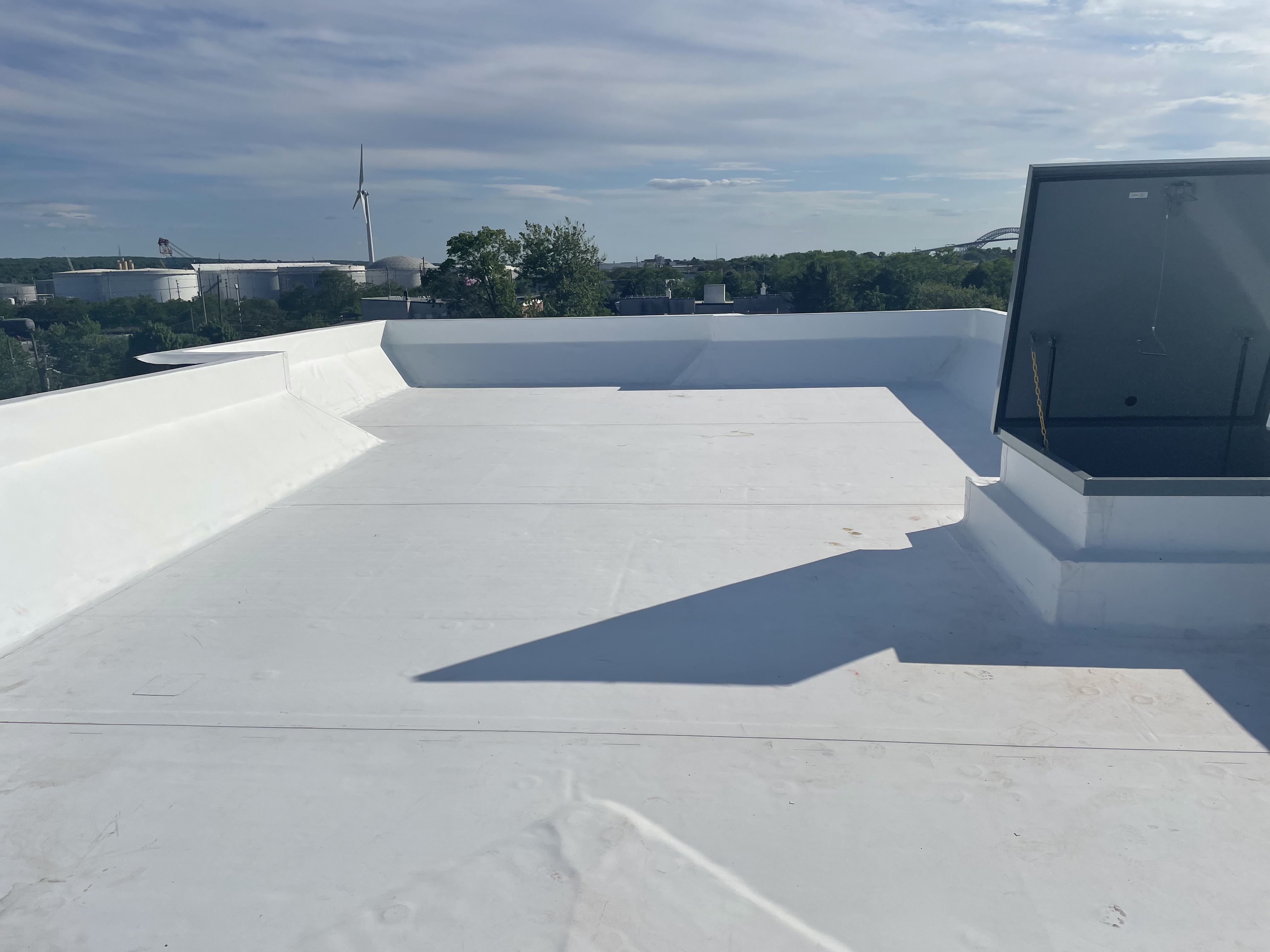Full commercial TPO white membrane roofing system installed on a multi-level flat roof in Passaic, NJ. The bright white 60-mil TPO membrane provides energy-efficient reflectivity, dramatically reducing cooling costs. All penetrations, HVAC equipment curbs, and parapet walls were fully flashed and detailed to create a completely watertight system.