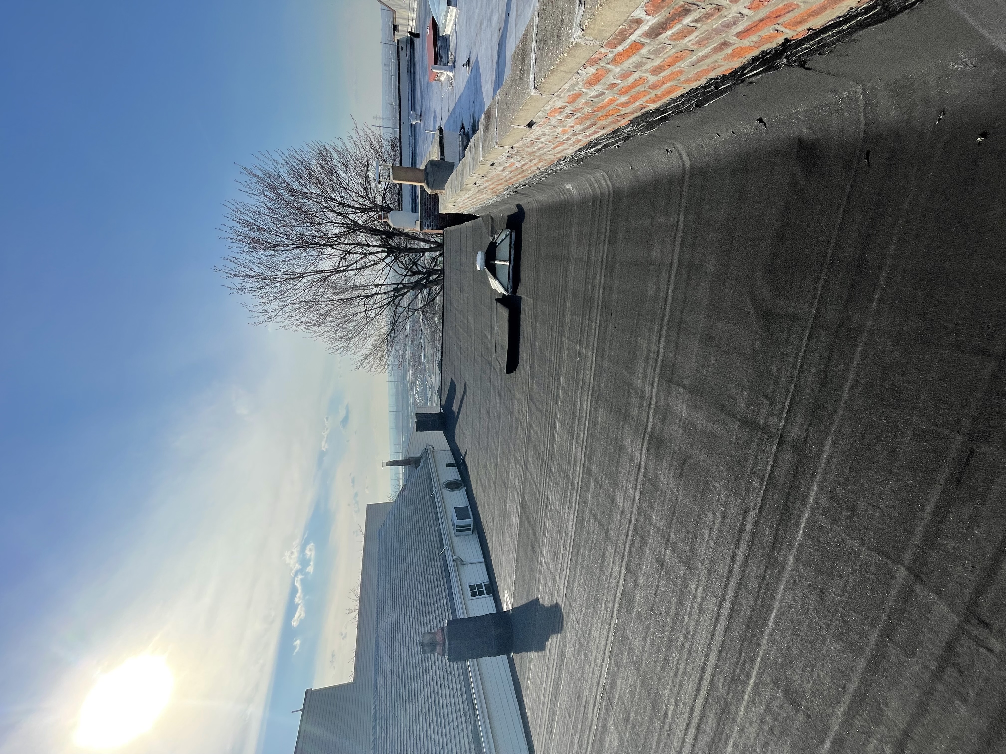 Old built-up roofing removed down to deck. Deck swept and minor imperfections filled. Tapered insulation installed to improve positive drainage. Base sheet rolled and self-adhered with 6" lapped seams. Cap sheet installed with 4" lapped seams, edges heat-sealed at terminations. All penetrations and perimeter edges detail-coated.