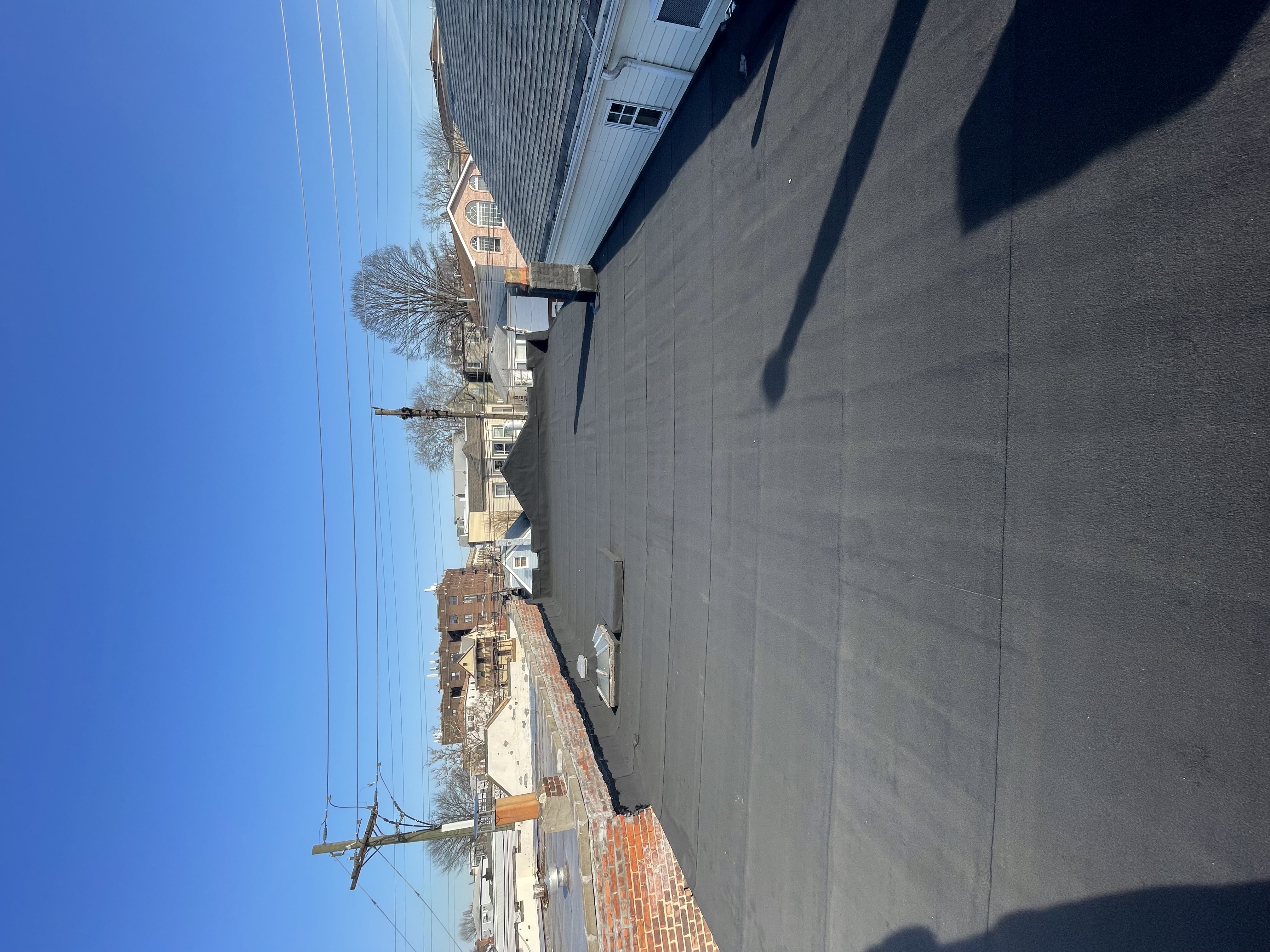 Complete flat roof replacement on a residential property in Clifton, NJ. The old gravel-topped built-up roof had cracked and failed, causing water intrusion. Duraproof installed a modern peel-and-stick self-adhered membrane system — a premium residential flat roofing choice that provides a seamless waterproof barrier without open flames or hot asphalt.
