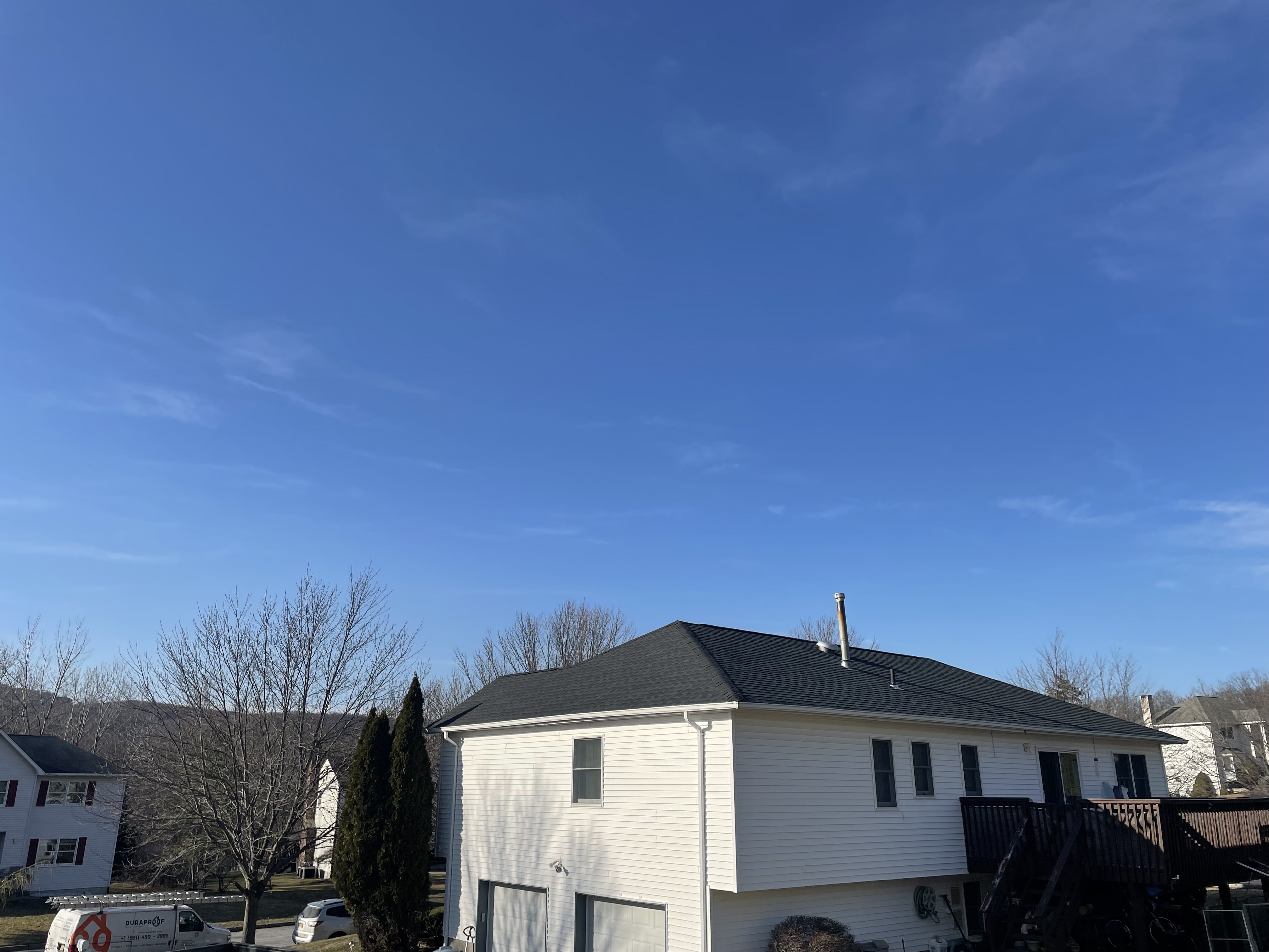 Complete tear-off and full roof replacement on a two-story residential home in Wayne, NJ. The existing asphalt shingles had reached end of life with widespread granule loss, cracking, and active leaks. Duraproof replaced the entire roof system with GAF Timberline HDZ architectural shingles in Charcoal, delivering a sharp, modern look with industry-leading 130 mph wind resistance.