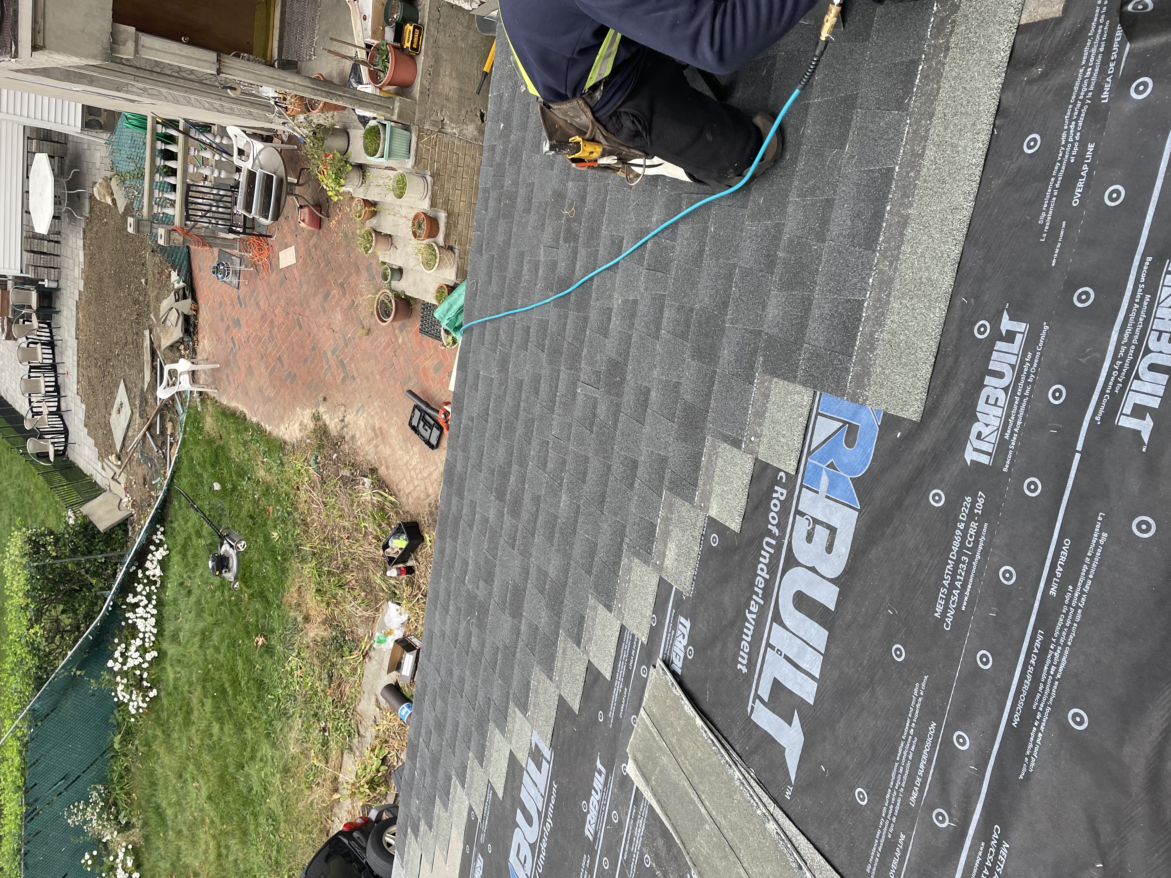 Day 1: Full tear-off, debris removal, decking inspection and repairs. Day 2: Underlayment and waterproofing layers installed. Day 3: Shingle installation and ridge cap. Job site clean-up with magnetic roller sweep.