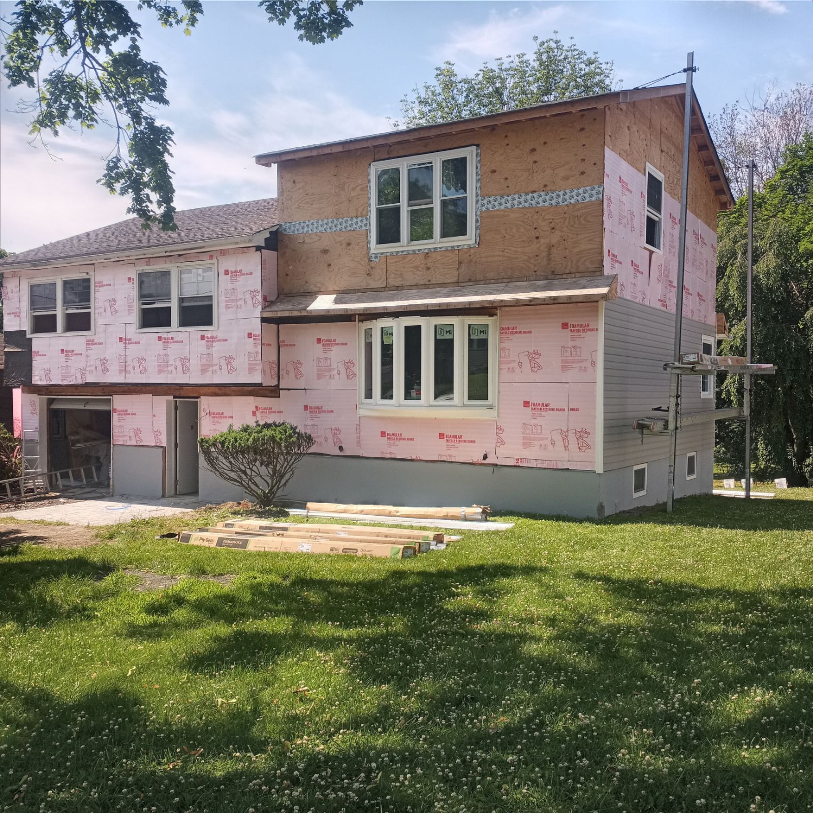 Full removal of existing wood siding and trim. Sheathing inspected and damaged sections repaired. Tyvek HomeWrap installed over entire exterior. Starter strip and corner posts set. Vinyl lap siding panels installed bottom-up, each course overlapping 1". Windows wrapped with PVC trim coil. J-channel installed at all windows and doors. Soffit and fascia replaced with matching aluminum coil wrap.