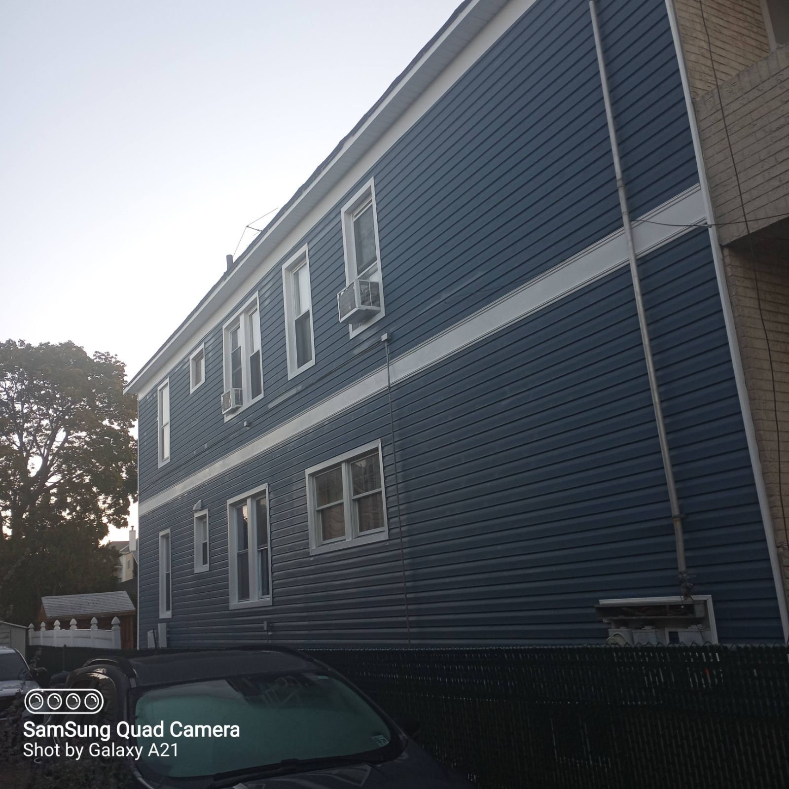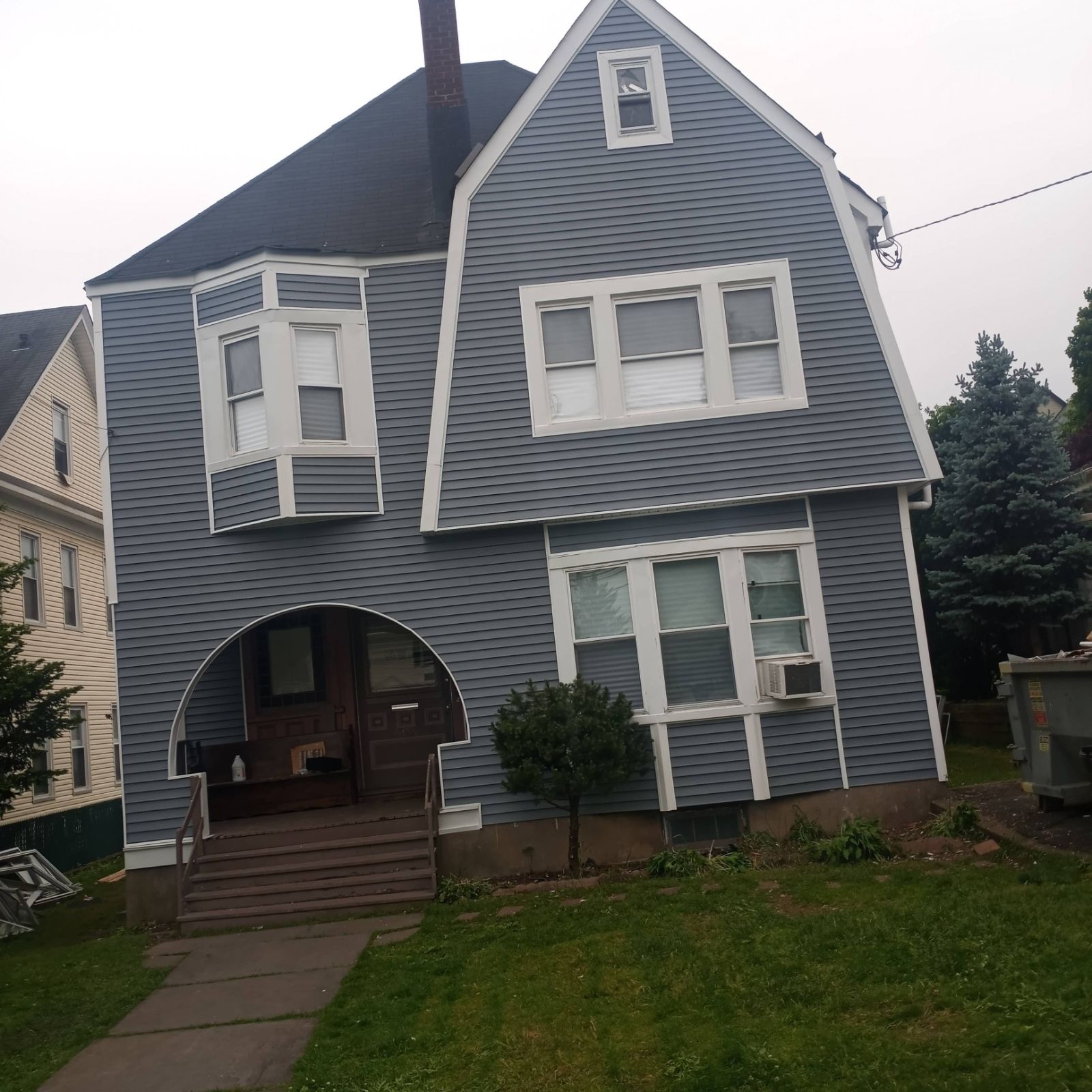 The multi-family property has been completely transformed with a sharp navy and white exterior that dramatically increased curb appeal and property value. The new insulated vinyl system eliminates repainting costs indefinitely and improves the thermal envelope.