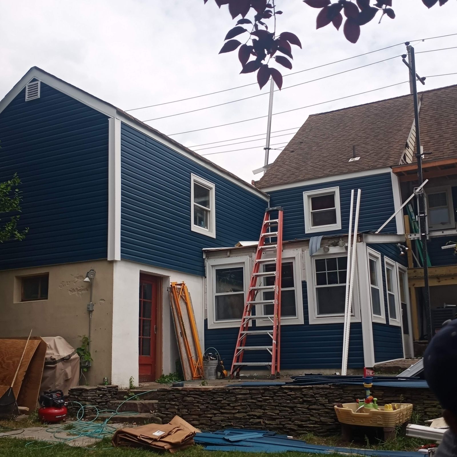 CertainTeed Monogram vinyl lap siding (Navy Blue), CertainTeed trim coil and corner post, Tyvek HomeWrap house wrap, J-channel and starter strip, PVC window trim wrap, foam backer insulation strips, stainless steel nails